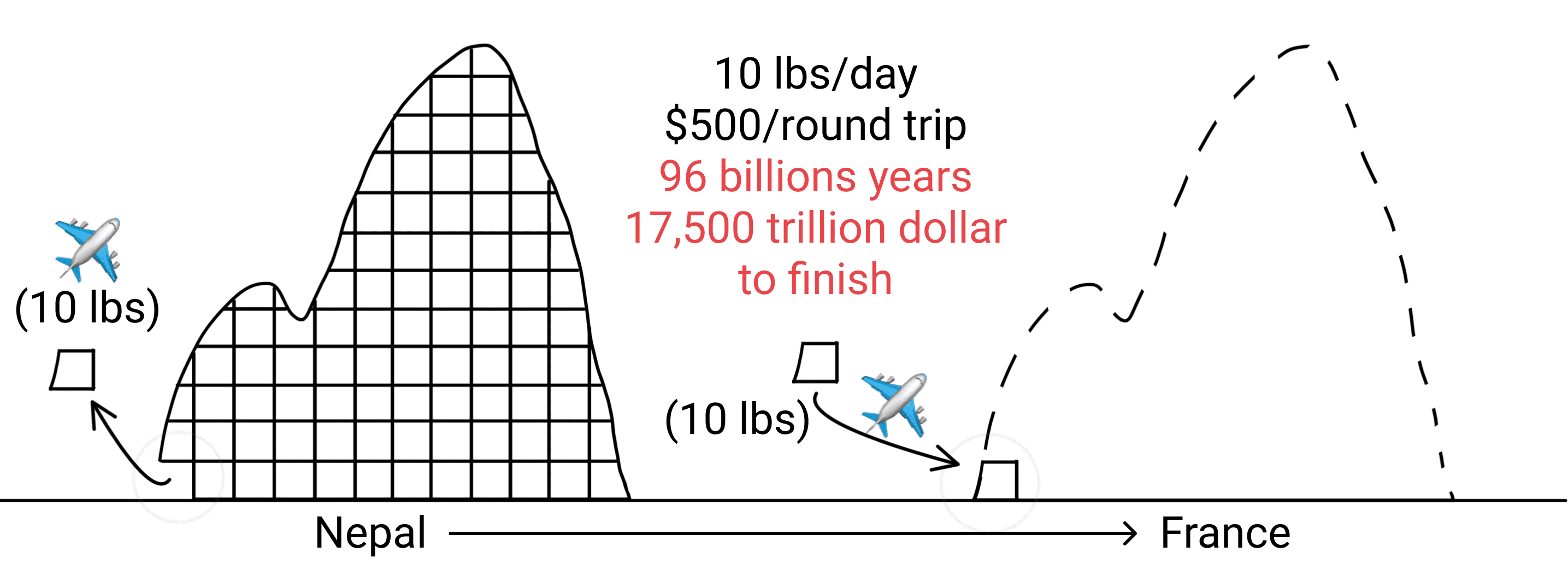 - Move mount Everest from Nepal to France in under 10 years and under 1 billion USD.