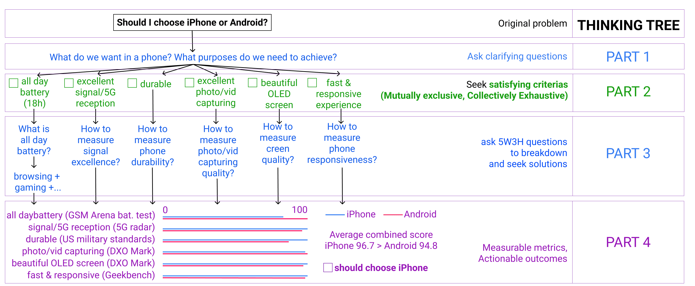 - Try to answer these example problems: How to move mount Everest? How much is the Virtual Reality glass market size? Should I choose iPhone or Android?